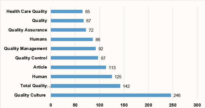 Las palabras clave se analizaron directamente de los documentos publicados, teniendo en cuenta la frecuencia de aparición de las palabras clave más utilizadas, como se muestra en el gráfico 3, evidenciado como las más utilizadas a: quality culture, total quality management, human, article y quality control, con una frecuencia promedio de 144 veces.