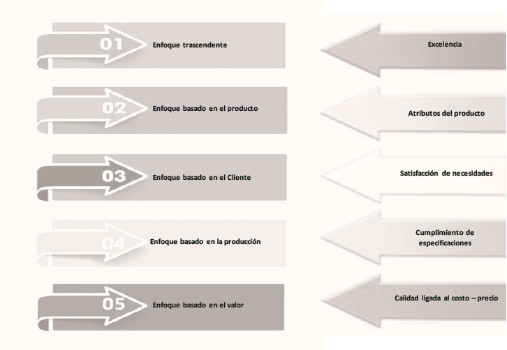 En cuanto al concepto de la calidad, Benzaquen & Convers (2015) y Chen (2016) afirman que, inicialmente, fue definida como la propiedad o conjunto de características inherentes que le permiten diferenciarla de una de su misma especie. Actualmente, la ISO 9000.2015 la define como el grado en el que un conjunto de características inherentes a un objeto cumple con los requisitos (necesidades o expectativas establecidas, generalmente implícitas) (ICONTEC, 2015). Miranda et al, (2007) agruparon los diferentes conceptos de calidad en 5 enfoques (diagrama 2):