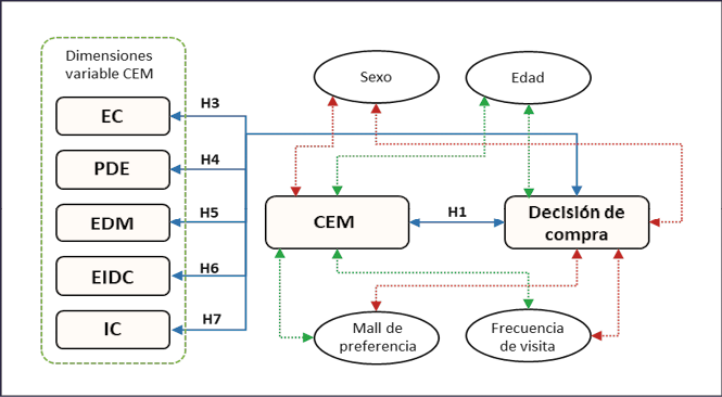 Se consideró las siguientes hipótesis a demostrar: HG: Es probable que el Customer Experience Management tenga una relación positiva muy fuerte con la decisión de compra de los millennials en los malls de la ciudad de Arequipa. H1: Es probable que el nivel de customer experience management sea bueno y esté relacionado con la edad, sexo y preferencia de los millennials en los malls de la ciudad de Arequipa. H2: Es probable que el nivel de decisión de compra sea alto y esté relacionado con la edad, sexo y preferencia de los millennials en los malls de la ciudad de Arequipa. H3: Es probable que el entorno del consumidor tenga una relación positiva muy fuerte con la decisión de compra de la población millennials en los malls de la ciudad de Arequipa. H4: Es probable que la plataforma de experiencia tenga una relación positiva muy fuerte con la decisión de compra de la población millennials en los malls de la ciudad de Arequipa. H5: Es probable que la experiencia de marca tenga relación positiva muy fuerte con la decisión de compra de la población millennials en los malls de la ciudad de Arequipa. H6: Es probable que la estructura de la Interfaz del cliente tenga una relación positiva muy fuerte con la decisión de compra de la población millennials en los malls de la ciudad de Arequipa. H7: Es probable que la innovación continua tenga una relación positiva muy fuerte con la decisión de compra de la población millennials en los malls de la ciudad de Arequipa, 2021.