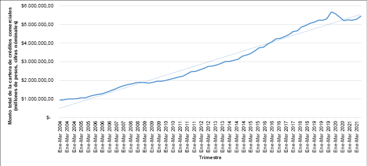 En los estudios de la relación entre el crecimiento económico y el sistema financiero, se ha encontrado que el crédito comercial influye en el crecimiento económico. Debido a que a través del crédito comercial se puede impactar en la cantidad de dinero en el mercado, lo cual, influye en la demanda y en el crecimiento económico. En este sentido, en México los créditos son el principal producto ofertado por el sector bancario, en específico el crédito comercial, que en el trimestre de octubre-diciembre de 2021, alcanzó en México la cantidad de $ 5,459,257 millones de pesos (Domínguez y Marroquín, 2016; López et al, 2018; Tercero et al, 2020; BANXICO, 2022 a; Hipsher, 2020; Baqaee et al, 2021). En la ilustración 1, se muestra la evolución de los créditos comerciales en México, donde, se aprecia que la línea de tendencia ha tenido un crecimiento positivo.