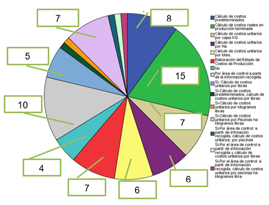 En cuanto al sector camaronero se observa que más del 69% los procedimientos de costeo lo realizan mediante costos: predeterminados, reales de producción terminada, por área de información, por hectáreas de las piscinas y el costo por libras. Encontrándose ciertas similitudes en estos sectores en sus procedimientos de controlar y costear su producción.