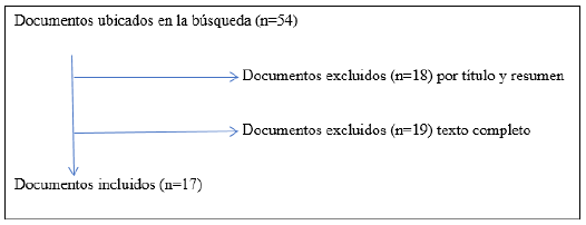 Por lo tanto, el objetivo de este trabajo fue analizar las pautas educacionales que se deben gestionar para garantizar el desarrollo de una cultura de paz en la universidad, para que las relaciones entre los actores universitarios sean basadas en el respeto, la solidaridad y la tolerancia. Se trata de una investigación documental, ya que se analizó un universo de 54 artículos científicos en español, del cual, al utilizar criterios de inclusión y de exclusión, la muestra final quedó de 17 artículos, todos relacionados con el desarrollo de una cultura de paz en el contexto universitario, que mostraran o propusieran acciones educativas para gestionar una cultura de la paz en ese ámbito; los demás artículos se excluyeron por no contener ambas palabras clave ni en el título ni en el resumen (18) y otros por no encontrar pautas o acciones de gestión de una cultura de paz entre los universitarios (19) como se muestra en la ilustración 1.