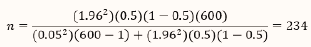 Donde 1.96 es el valor crítico correspondiente a un nivel de confianza del 95%, de acuerdo con una población normal; p= proporción esperada de preferencia (50%= .5); q= 1-p, N= tamaño de la población y d= precisión (5%). Por lo tanto:
