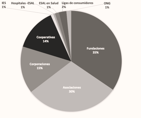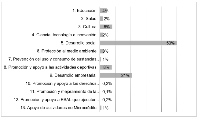 A 2022 se encontró, que un 84% corresponde a fundaciones, 8% a corporaciones, 6%a organizaciones no gubernamentales y un 2% restante a entidades de la economía solidaria; donde sus principales líneas de intervención o actividades meritorias se enfocan especialmente en educación con un 35%, paz y desarrollo social con un 31%, en salud con un 13% y otras 21%. Las cuales se dedican principalmente a actividades meritorias como desarrollo social, desarrollo empresarial y educación, entre ellas: las ONG enfocadas en filantropía, inversión y negocios sociales; las Fundaciones (empresariales y académicas) en filantropía, inversión social, negocios inclusivos, negocios responsables, negocios sociales y valor compartido; y las organizaciones de la Economía Solidaria desarrollan actividades en inversión social; como se observa en la (Gráfico 2).