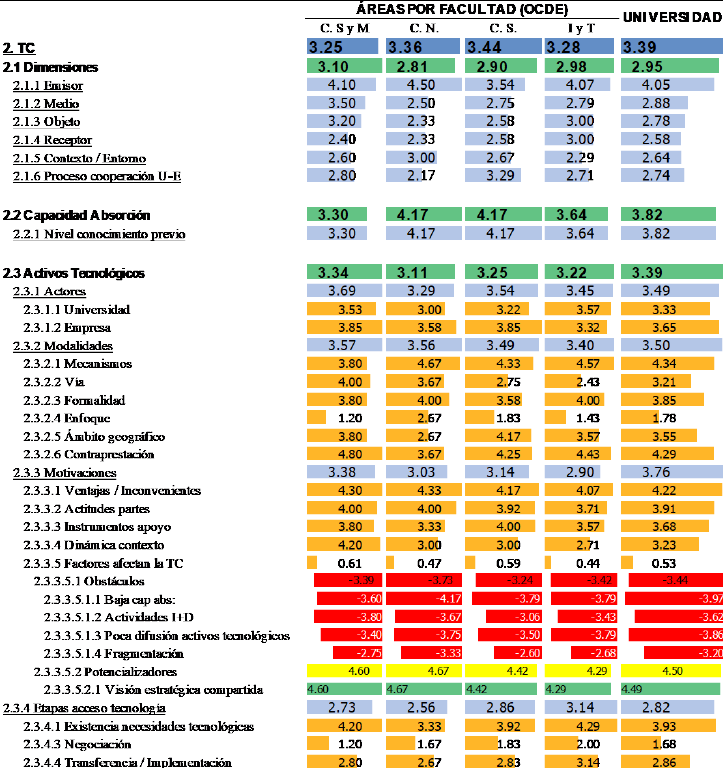 Las categorías de SRI y TC se analizan a partir de los resultados de los reactivos aplicados en la tabla 7, se realiza un análisis de estas categorías. En TC (tabla 5) resalta el nivel de capacidad de absorción de las empresas con las que tienen relacionamiento los grupos consultados, dado que en dos áreas de conocimiento (C.N. y C.S.) superan el 80 % (4.17), diferente del 66 % de la absorción en C. M. y S. En las dimensiones de la TC, se resalta el emisor (generalmente universidades) con un valor institucional de 81.07 % (4.05).