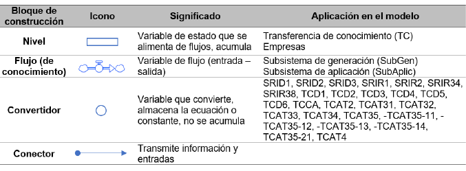 Con los indicadores propuestos como valores iniciales (diagnóstico), se simula con el software Stella Profesional (versión 9.2.3) modelando la dinámica del SRI, recreando las categorías y factores y, dado que éstos se constituyen por subsistemas de generación (U) y de aplicación (E) se acogen los elementos (tabla 6).