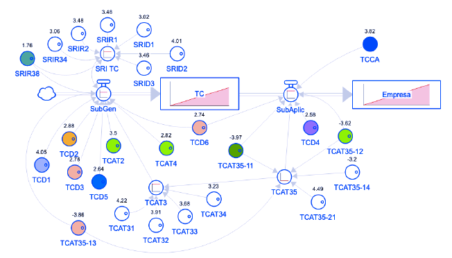 Es importante destacar que 12 variables (SRID1, SRID2, SRID3, SRIR1, SRIR2, SRIR34, TCAT31, TCAT32, TCAT33, TCAT34, TCAT35-14 y TCAT35-21) en el modelado de dinámica de sistema para este diagnóstico de la relación U-E, si se realiza un esfuerzo (incremento – decremento) no inciden (factores neutros) en la dinámica de la TC.