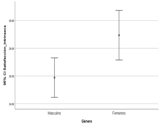 También se realizó la prueba T de student para encontrar diferencias en las dimensiones de los instrumentos en cuanto al género de los participantes. Y se registró una diferencia significativa en la satisfacción intrínseca, demostrando que el género femenino tiene una mayor satisfacción intrínseca que los hombres, tal y como se muestra en el gráfico 2.