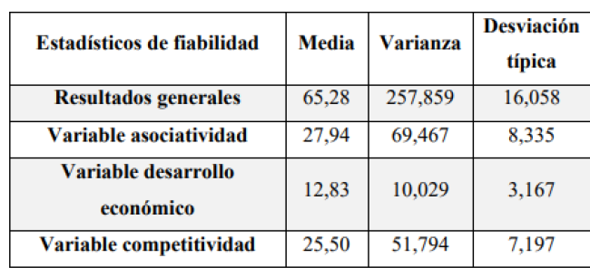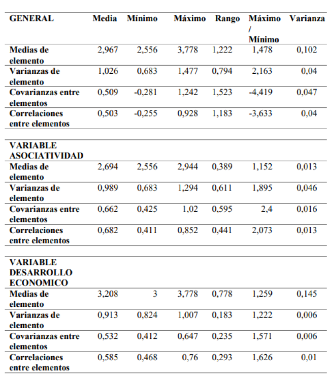 En la tabla 16, se presentan los valores estadísticos de resumen de los elementos de forma general y detallada con sus variables y sus elementos. Como se puede observar, la variable de asociatividad, guarda relación con la variable de desarrollo económico, que presenta una media a partir de 3.78 %.