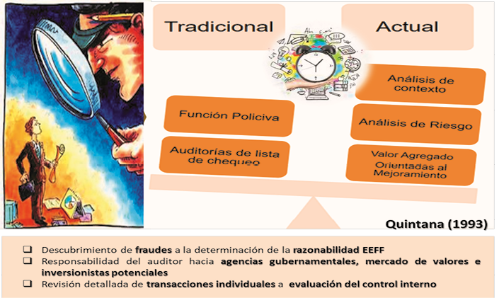 El cambio del viraje de la naturaleza de las labores de auditoría se aprecian en la ilustración 1 donde detalla el paso de la función “policiva” y de auditorías de lista de chequeo como naturaleza principal de las labores de auditoría a los análisis de contextos, riesgos implícitos y que aportan están labores a la aplicación de recomendaciones para el mejoramiento continuo centrado en las evaluaciones del control interno y sus aplicaciones que permitan generar constantemente la razonabilidad de los estados financieros auditados.