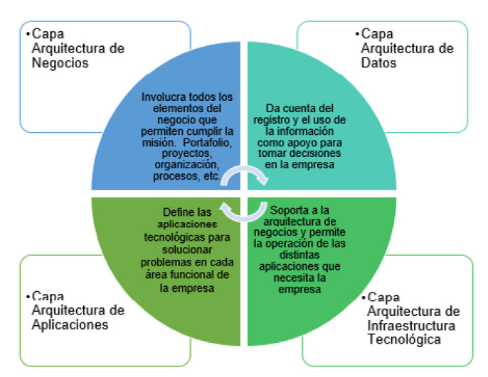 La AE empresarial debe visualizarse como una metodología que se encuentra basada en una visión global de la empresa, la cual permite se pueda hacer una alineación de los procesos, datos, aplicaciones e infraestructura tecnológica con los objetivos corporativos. En la AE es fundamental que se logre identificar seis elementos esenciales: Estrategia, gobierno de TI, información, sistemas de información, servicios de tecnología, uso y apropiación (Mejía, 2013). La AE ayuda a que las empresas empleen las mejores prácticas, tomen decisiones consistentes en el presente y tenga en cuenta las consideraciones de las necesidades futuras percibidas del negocio (Wamema et al, 2023).