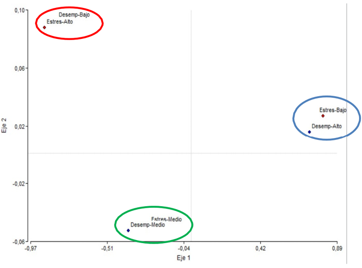 Por otro lado, el análisis de correspondencia llevado a cabo en este estudio ofrece una representación visual de la relación entre el nivel de estrés y el rendimiento laboral de los individuos. En el gráfico 1, se pueden identificar tres grupos principales de individuos, cada uno de ellos representado por un color específico en el plano: