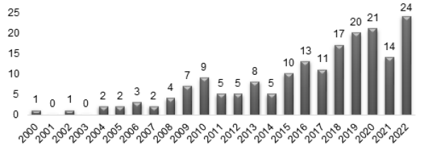 En el gráfico 1, se presenta la evolución de la producción científica durante el período de 2000 a 2022 con la temática de Capacidad de absorción y crecimiento económico en Web of Science. La cúspide de publicaciones fue en el año 2022 con 24 artículos. De 2000 a 2015, la mayor producción fue en 2015 con diez artículos, mientras que de 2016 a 2022 las publicaciones fueron superiores a once.