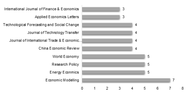 El Gráfico 5 muestra los resultados de las revistas con más publicaciones relacionadas con la capacidad de absorción y el crecimiento económico; se observa que Economic Modelling publicó siete artículos, seguido de Energy Economics, Research Policy y World Economy con cinco publicaciones.