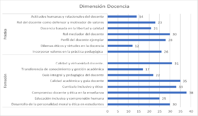 Del análisis de contenido de los testimonios, se sistematiza un total de 30 indicadores, distribuidos entre las tres dimensiones, y, en cada una, se diferencian dos subdimensiones: formación y práctica. Así, en el Gráfico 1 se puede observar que la dimensión con mayor porcentaje es Docencia con 15 indicadores (50%), evidencia mayor atención en ética por el profesorado; seguida de la dimensión Investigación con 11 (37%) y de vinculación con 4 indicadores (13%).