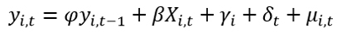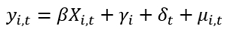 En esta ecuación, la variable y_ (i, t) representa el ratio deuda pública / PIB para un país i durante el año t, mientras que X_ (i, t) representa un conjunto de variables explicativas, γ_i representa el efecto fijo país, y δ_t el efecto fijo temporal. El término μ_ (i, t) representa el término de error que capta los efectos de las variables omitidas.