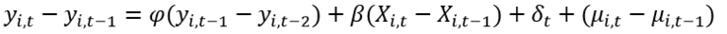 El estimador GMM se basa en el supuesto de que los términos de error no están correlacionados en serie y que las variables explicativas son débilmente exógenas o no están significativamente correlacionadas con realizaciones futuras de los términos de error bajo los cuales se cumple la siguiente condición de momento para el estimador en primera diferencia.