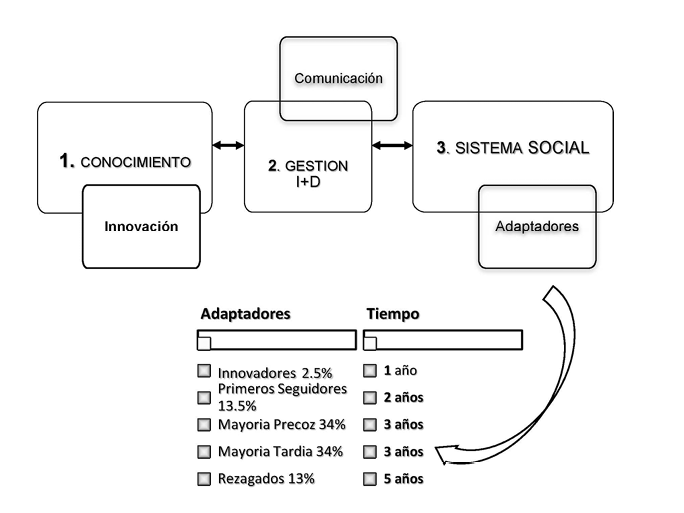 El modelo se fundamenta igualmente en la teoría de Rogers Everest; está basado en cuatro elementos que la definen: la innovación, los canales de comunicación, el tiempo y el sistema social. Medido el sistema por los adaptadores, propone una categorización y distribución cuantitativa para quienes adoptan una innovación o idea, valorándoseles como innovadores (2,5%), usuarios tempranos (13,5%), primera mayoría (34%), mayoría tardía (34%) y los más rezagados (16%); el estudio está basado matemáticamente en la curva de distribución en campana (de Bell).