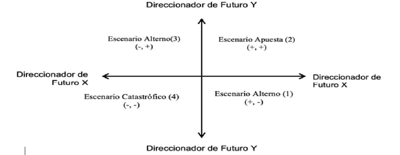 En el diagrama 5 del modelo de implementación se observa cómo ordenar en forma lógica los diversos escenarios de horizontal y vertical. Donde, de forma vertical, se va desde el escenario catastrófico al escenario de apuesta. Son tres niveles de forma horizontal donde en el primer nivel están los escenarios catastróficos, en el escenario central los escenarios alternos y en el nivel superior los escenarios apuestan, todos guiados por direccionadores de futuro, tanto en ejes de X como en ejes de la Y, como se definió previamente. Las políticas, el programa e indicadores se mencionan y deben ser definidos en el modelo de evaluación (diagrama 5).