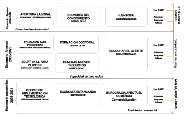 Es importante que los escenarios alternos de formación doctoral y generación de nuevos productos se consideren parte del plan que se propone en esta investigación y se inicien acciones donde se establezcan indicadores de desempeño medibles y pertinentes, como la cantidad de investigadores, generación de patentes y publicaciones en revistas de arbitraje internacional (Scopus), para acercarnos a una economía de innovación, prestando especial atención a salir del escenario catastrófico.