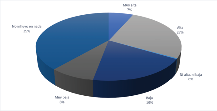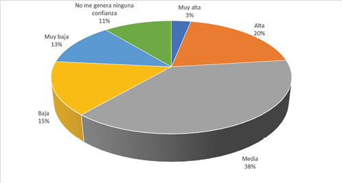 Lo que concierne al nivel de confianza que tienen los emprendedores en las entidades promotoras de emprendimiento (gráfico 4), el puntaje más alto lo tuvo la opción media con 98 repuestas (37,1%), seguido de alta con 51 respuestas (19,7%). En este caso, 157 respuestas están en la parte alta, con media alta y muy alta, equivalente al 60,6%.