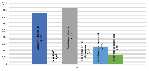 Si sumamos los valores parcialmente de acuerdo, de acuerdo y totalmente de acuerdo, tendríamos 208 respuestas equivalentes al 80,3% del total de encuestados, lo que se considera una posición que indica que el fomento o la promoción genera seguridad en los individuos para emprender.
