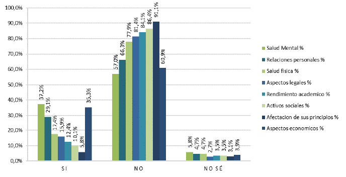 Los resultados también revelaron que gracias a estos efectos adversos, muchos de estos emprendimientos llegan a la deserción de la creación de empresa, debido a la alta carga y poco tiempo para atender compromisos como el estudio, además de no encontrar respaldo ni acompañamiento por parte de las instituciones para validar sus emprendimientos como proyecto de grado, a pesar de estar aprobado por la universidad para graduarse y de ser una ley del gobierno nacional para el fomento del emprendimiento. En el análisis también fue posible identificar que los efectos adversos directos de emprender se generan tanto en los emprendedores que fracasan como en los que tienen éxito, ya que más del 65% de los encuestados tiene sus emprendimientos activos, así no estén constituidos, pero en casi todos los casos los emprendedores han evidenciado que sufren efectos adversos.