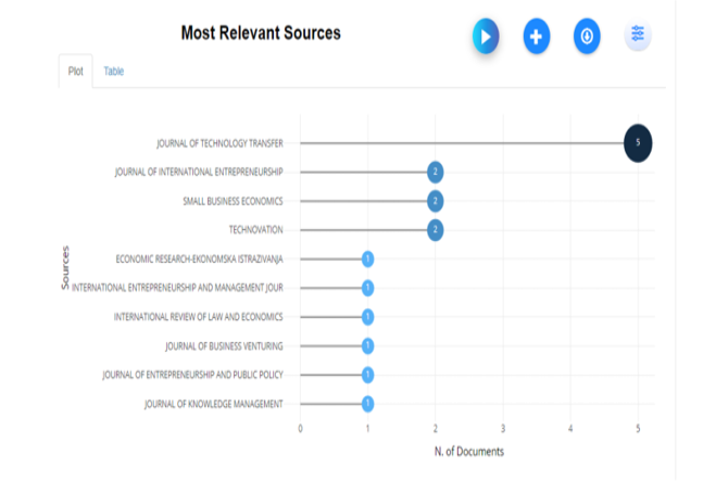 El análisis bibliométrico de los 23 artículos seleccionados reveló las fuentes más relevantes en el estudio de las Spin offs académicas, la transferencia de tecnología y la interacción entre emprendimiento académico y entorno económico. La figura destaca diez journals con mayor producción científica (gráfico 1), especializados en innovación, transferencia de conocimiento y emprendimiento internacional.
