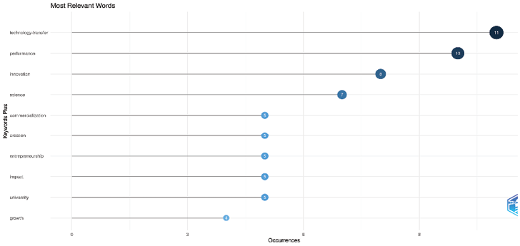 Otros términos significativos como “innovation” (9 menciones) y “science” (7 menciones) apuntan hacia una narrativa centrada en la creación de valor desde la ciencia hacia el mercado mediante la innovación. Asimismo, la presencia de términos como “commercialization”, “entrepreneurship” y “university” subraya la relevancia del contexto institucional y del emprendimiento académico en estos procesos. La palabra “growth”, aunque menos frecuente, sugiere que el crecimiento de las Spin off se contempla como un resultado esperado de la correcta combinación de tecnología, innovación y comercialización. Este análisis permite delinear la estructura conceptual de los estudios más relevantes, mostrando un enfoque integral que integra tanto aspectos operativos como estratégicos.