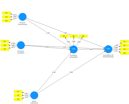 Los datos recopilados fueron analizados con SmartPLS, permitiendo realizar el Modelado de Ecuaciones Estructurales (PLS-SEM) y evaluar las relaciones entre las variables del ecosistema emprendedor (Hair & Alamer, 2022). El coeficiente de determinación (R²) mostró que el modelo explica una parte considerable de la varianza en la consolidación de emprendimientos, demostrando la relevancia de las relaciones significativas entre las variables.