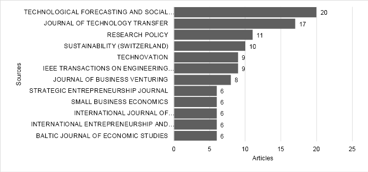 The first journal is “Technological Forecasting and Social Change” with 20 publications (3.7% of the total analyzed works) interested in methodologies and technological prediction studies as planning tools since they interrelate social, environmental, and technological factors. The “Journal of Technology Transfer” has 17 publications and focuses on research related to the human and social dynamics of the entrepreneurial phenomenon, with a view towards small organizations with growth potential. In third place is the “Research Policy” with 11works, a multidisciplinary journal seeking papers examining various contexts and business management topics.