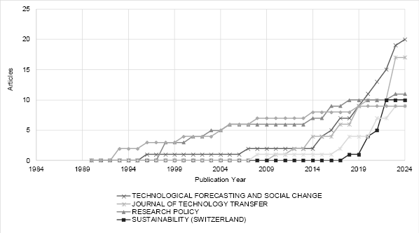 It is also interesting to examine the evolution of journal publications. In this context, graphic 3 compares the top five journals with the highest number of publications on the topic in terms of publications per year. It is observed that during the years 1993-1997, the Technovation had the highest number of publications. However, starting in 1998, Research Policy stands out again, followed by the Technological Forecasting and Social Change and Journal of Technology Transfer.