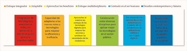 Finalmente, Lau-Hoyos et al, (2024), Neumann et al, (2024) y Kaun et al, (2024) piensan que el Gobierno Digital puede mejorar la educación y la administración pública usando inteligencia artificial combinada con la automatización. Esto requiere una gestión pública que no solo se adapte tecnológicamente, sino que también considere factores humanos y éticos, como la confianza y la percepción pública hacia estas tecnologías. En resumen, esta fundamentación teórica muestra un movimiento hacia un enfoque integrador en la gestión pública, necesario para aprovechar los beneficios de la era digital, manteniendo un enfoque multidisciplinario y centrado en el ser humano para enfrentar los desafíos de hoy día. A continuación, la Ilustración 1 muestra un resumen esquemático de los principios clave en la gestión pública digital de acuerdo con la fundamentación teórica previa.