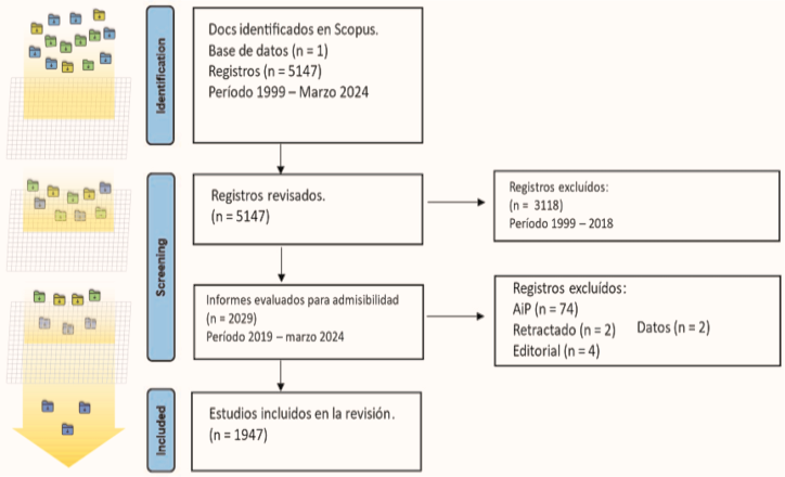 Durante la fase de cribado, se aplicó un criterio temporal que excluyó 3118 documentos publicados entre 1999 y 2018. Posteriormente, se evaluaron 2029 informes publicados entre 2019 y marzo de 2024, de los cuales se excluyeron 80 por razones como artículos en prensa (74), documentos retractados (2), editoriales (4) y datos (2). Finalmente, se seleccionó una muestra de 1947 estudios para esta revisión bibliométrica, proporcionando una base sólida y actualizada para el análisis.
