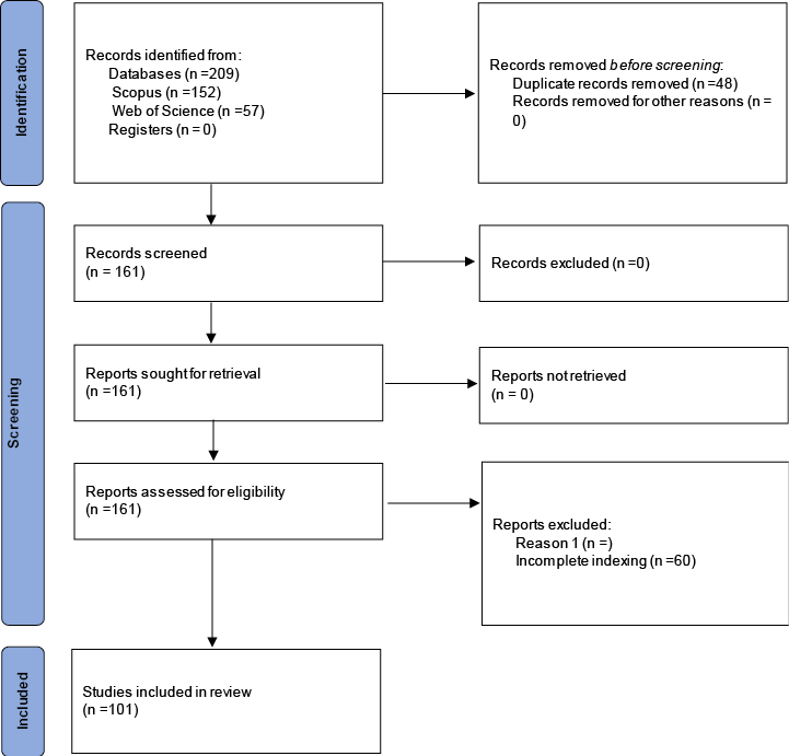 Inicialmente, se realizó la identificación de artículos mediante estrategias de búsqueda específicas aplicadas a cada fuente de información seleccionada. Esta fase inicial también incluyó la eliminación de registros duplicados para asegurar la integridad de los datos. Posteriormente, se llevaron a cabo tres fases de exclusión basadas en criterios predefinidos para refinar la selección de artículos. Finalmente, tras este proceso, se identificaron y seleccionaron un total de 101 artículos que cumplían con los criterios de inclusión establecidos, conformando el corpus principal de esta bibliometría.
