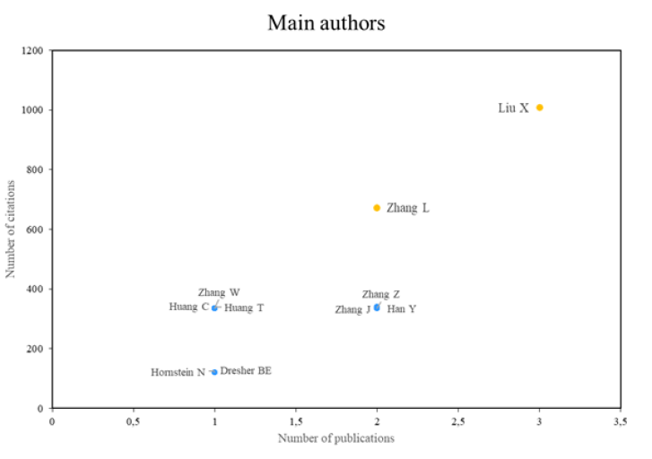 En cuanto a los principales autores (gráfico 2), se identificaron tres grupos distintos en función de su productividad e impacto. En primer lugar, destacan autores como Liu X y Zhang L, quienes exhiben tanto una alta productividad como un impacto significativo en la comunidad científica. En segundo lugar, se encontró un grupo de autores, entre los que se incluyen Zhang J, Huang C y Dresher BE, que, a pesar de tener un bajo índice de productividad científica, muestran un impacto notable en sus publicaciones. Por último, otro grupo de autores se distingue por su alta productividad, aunque sus trabajos no alcanzan un elevado número de citaciones.