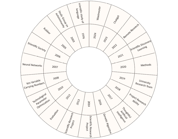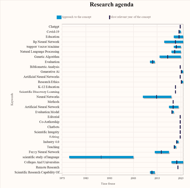 En la ilustración 1, se exploró la evolución temática en la literatura sobre el uso de técnicas de inteligencia artificial en la investigación científica. Se llevó a cabo un análisis de la palabra clave más frecuentemente utilizada en cada año de investigación desde 1976 hasta 2024. Se destaca que, en el año 1976, como punto inicial, surgieron conceptos como “Scientific study of language”. En los años más recientes se evidencia una predominancia de temas emergentes como “ChatGPT”, “Remote research”, “Scientific Discovery learning”, “methods” y “University research team”, lo cual refleja las tendencias actuales de investigación en este campo.