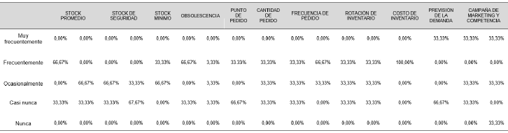 Por otro lado, se pudo conocer que es necesario fortalecer el monitoreo y ajuste de la frecuencia de pedido, ya que dos tercios de los empleados no perciben que la empresa realice un ajuste dinámico de este factor en función de las condiciones cambiantes, como las condiciones del mercado, la demanda de los clientes y el plazo de los proveedores. La empresa determina la frecuencia de pedido considerando el consumo promedio, el tiempo de reabastecimiento, el stock de seguridad y la variabilidad de la demanda.