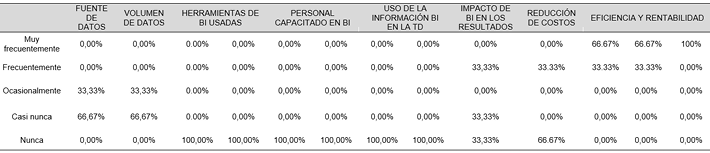 Esta variabilidad podría deberse a diferencias en la implementación y uso de herramientas de inteligencia de negocios, la calidad y cantidad de datos disponibles, o la madurez y habilidades del personal en la empresa para utilizar estas herramientas de manera efectiva. Las empresas que han observado beneficios frecuentes podrían estar más avanzadas en su uso de BI, mientras que aquellas que no han visto impacto podrían necesitar mejorar su infraestructura de datos o capacitación del personal.