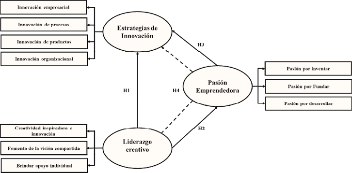 La revisión de la literatura realizada por el autor revela la falta de evidencia empírica que explore el vínculo entre liderazgo creativo, pasión emprendedora y estrategias de innovación como constructos latentes. Sin embargo, investigadores han explicado que la pasión se considera el corazón del emprendimiento y puede convertirse en un indicador importante de la creatividad (Hu et al., 2018). La creatividad implica la generación de ideas novedosas y útiles, que se implementan como estrategias de innovación en nuevos productos y procesos (Sarooghi et al., 2015). Por lo tanto, se plantea la siguiente hipótesis y se presenta el modelo conceptual en el diagrama 1: