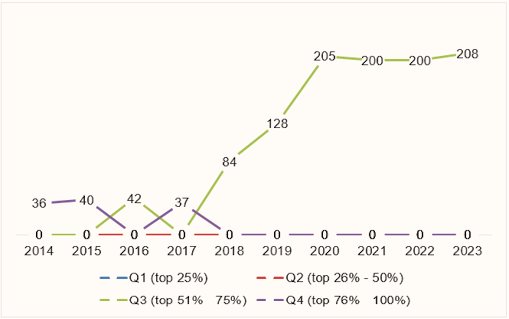En el gráfico 1 se muestra la producción científica de la revista por año, considerando el período de estudio 2014–2023. En el gráfico se evidencia un incremento de la producción generada en los años 2018, 2019 y 2020 en relación con el año inmediatamente anterior. Esto se debe a la publicación en el año 2018 de la primera edición especial de la revista, la cual se mantiene en el año 2019, y a partir del 2020 hasta el 2024, se incrementa a dos ediciones especiales por año con un total de 50 trabajos cada una. En la actualidad, la revista publica cuatro ediciones ordinarias con 26 artículos cada una y dos especiales.
