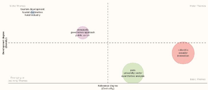 En el gráfico 4, el análisis del mapa temático muestra la predominancia del clúster relacionado con Colombia, el cual muestra una alta centralidad y densidad con valores de 4.83 y 13.18 respectivamente. Esto sugiere que los estudios sobre Colombia son frecuentes y están interconectados con otros temas. Lo anterior indica un enfoque colaborativo y un interés sostenido en la dinámica gerencial del país. Otro clúster relevante es Perú, aunque tiene una centralidad un poco menor (4.44) en comparación con el de Colombia. Este clúster presenta una densidad notable de 10.68. Esto sugiere que los temas de los artículos publicados tienden a abordar temas que son densamente interrelacionados, lo que puede indicar áreas de especialización o interés particular en la investigación peruana.
