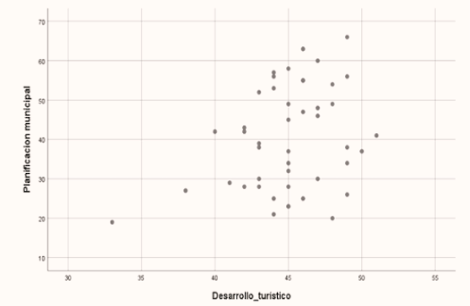 El análisis de correlación de Spearman no reveló una relación estadísticamente significativa entre la planificación municipal y el desarrollo turístico (sig. = 0.098; ρ = 0.25). Aunque el coeficiente sugiere una asociación positiva débil, el valor de significancia impide afirmar que exista una correlación sólida entre ambas variables. Esto podría deberse a una ejecución fragmentada de los planes municipales, con escasa articulación entre las propuestas técnicas y la realidad operativa del turismo local (tabla 3).