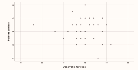 El análisis de la relación entre políticas públicas y desarrollo turístico reveló una correlación positiva muy débil y no significativa (ρ = 0.123; sig. = 0.422), lo que indica una ausencia de asociación estadística entre ambas variables (Tabla 5).