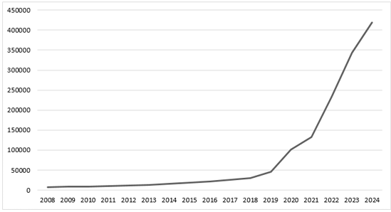Annex 13 has grown significantly in scope and funding. In 2008, the approved budget was 7,024.8 million pesos; by 2020, it had reached 103,517.8 million pesos. Subsequently, the executed budget continued rising: in 2021 it reached 132,652.1 million pesos; in 2022, 232,684.7 million pesos; and in 2023, 343,632.0 million pesos. For 2024, the approved budget amounts to 419,434.1 million pesos, representing an estimated 6.5% of total programmable spending (Transparencia Presupuestaria, 2024). While this growth may suggest increased institutional commitment, much of the funding is concentrated in universal programs lacking transformative design. Execution levels generally follow approved budgets, but discrepancies exist. The Graph 1 shows the trends in executed budgets from 2008 to 2024.