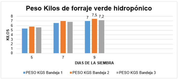 La biomasa verde, definida como la conversión de maíz grano comercial en forraje hidropónico, se determinó pesando el contenido de cada bandeja al final del ciclo de producción. Los resultados mostraron una producción de biomasa verde entre 7 y 8 kg por bandeja a los 9 días de la siembra. Este rendimiento evidencia la eficiencia del sistema en la transformación de insumos en forraje, maximizando el uso del espacio vertical mediante anaqueles y optimizando el manejo de recursos como el agua y los nutrientes (gráfico 2).