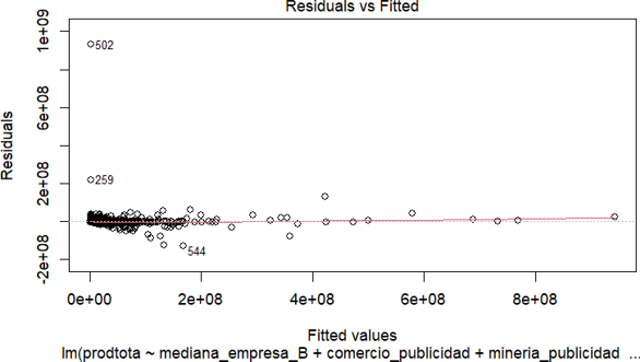 En el análisis presentado, es crucial destacar la significancia estadística de ciertas variables y la ausencia de influencia significativa de otras en el contexto empresarial ecuatoriano. Cabe destacar que variables como “Comercio_publicidad”, “Manufactura*publicidad”, “Comercio*ventas”, “Minería*ventas” y “Manufactura*ventas” mostraron una influencia estadísticamente significativa al nivel de 0,05, lo que indica un impacto considerable de la publicidad y las ventas en la producción de estos sectores. Por el contrario, variables como “Mediana_empresa” y “Minería*publicidad” no mostraron un efecto estadísticamente significativo, lo que sugiere que el tamaño de la empresa, en el caso de las medianas empresas, y la publicidad en el sector minero no son determinantes cruciales de la producción a este nivel de significancia.