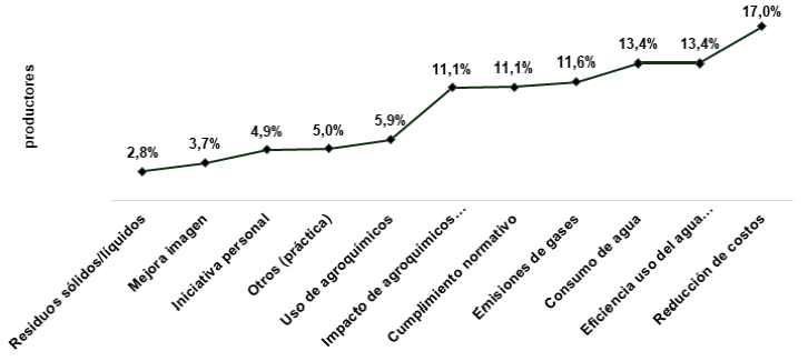 Esta limitación también se refleja en los aspectos ambientales considerados prioritarios. Destacan la eficiencia en el uso del agua (34,6%) y el efecto de agroquímicos en el suelo (28,54%), ambos directamente asociados a la rentabilidad del cultivo, pero no necesariamente a una visión holística de gestión ambiental. En cuanto a la evaluación del impacto ecológico, el 49,6% de los productores utiliza indicadores económicos como multas o costos por residuos, revelando un enfoque predominantemente reactivo.