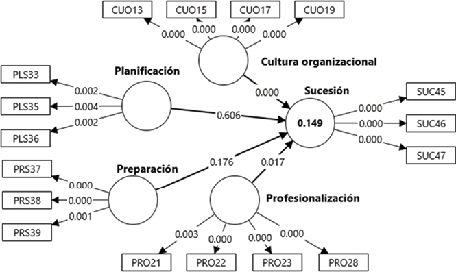 En cuanto al análisis Path, se encontró que las variables cultura organizacional y profesionalización presentan significación estadística (p < 0,05), mientras que preparación del sucesor y planificación de la sucesión no alcanzaron el nivel de significación requerido (Hair et al., 2016), por lo que se aceptan las hipótesis H1 y H4 y no se aceptan la H2 y H3. En el Diagrama 2 se presenta el modelo de ecuaciones estructurales.