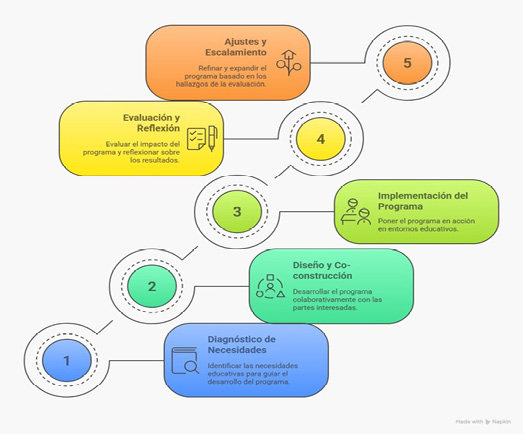 El diagrama 2 presenta el proceso cíclico de evolución transformacional del programa que destaca sus cinco fases, desde la identificación de necesidades hasta la evaluación y escalamiento. Este modelo permitió ajustes continuos para optimizar el impacto educativo. También grafica cómo las distintas fases del proceso interactuaron entre sí, desde la identificación de necesidades hasta la implementación y validación del programa. El diagnóstico de necesidades educativas abordó desafíos en liderazgo, motivación y clima escolar, e incluyó grupos focales y entrevistas con docentes, padres y especialistas. El diseño y co-construcción del programa incluyó el desarrollo de estrategias basadas en evidencias y consensos; asimismo, la integración de actores clave (docentes, familias y especialistas).